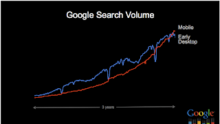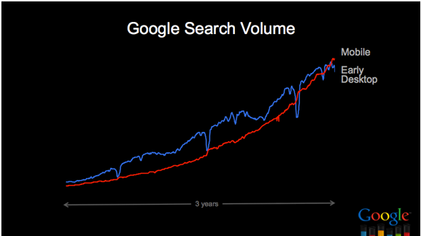 Qui puoi vedere che negli ultimi 3 anni la crescita della ricerca su dispositivi mobili (linea rossa) è equiparabile a quella complessiva del traffico su Google.com nello stesso arco temporale (linea blu) all’inizio della nostra storia.