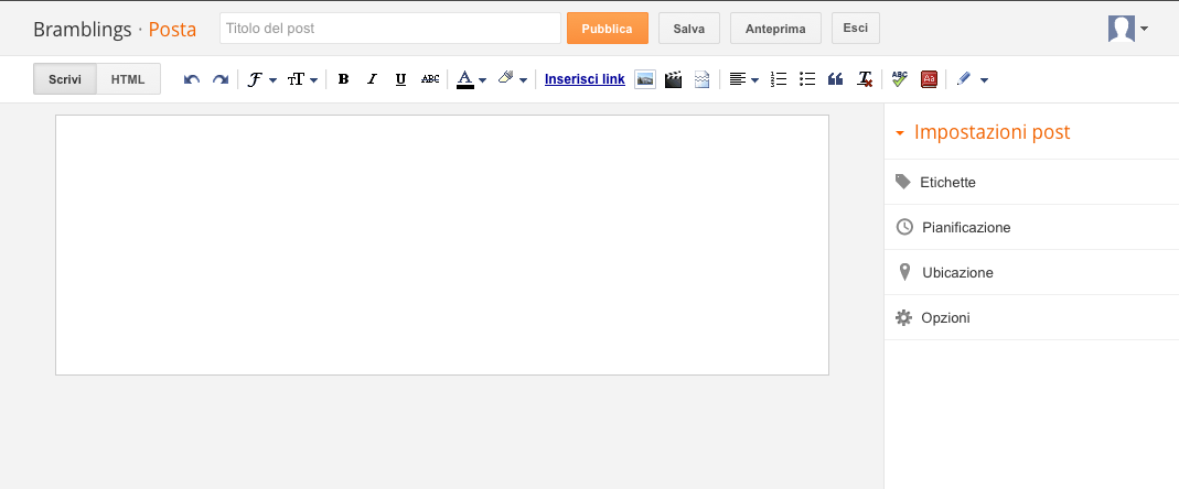 Che siate sulla bacheca o sulla pagina delle impostazioni di blogger.com potrete creare o modificare un post con un solo clic nella parte superiore del vostro schermo. L’editor dei post inoltre è stato ingrandito e semplificato per darvi più spazio per scrivere e visualizzare l’anteprima del vostro post.