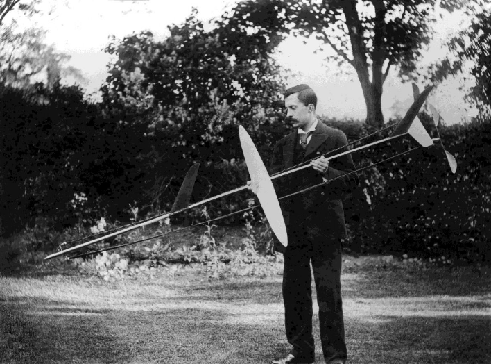 Questo è Lanchester nel 1894, alle prese con uno dei suoi eleganti modelli di aereo a eliche spingenti: