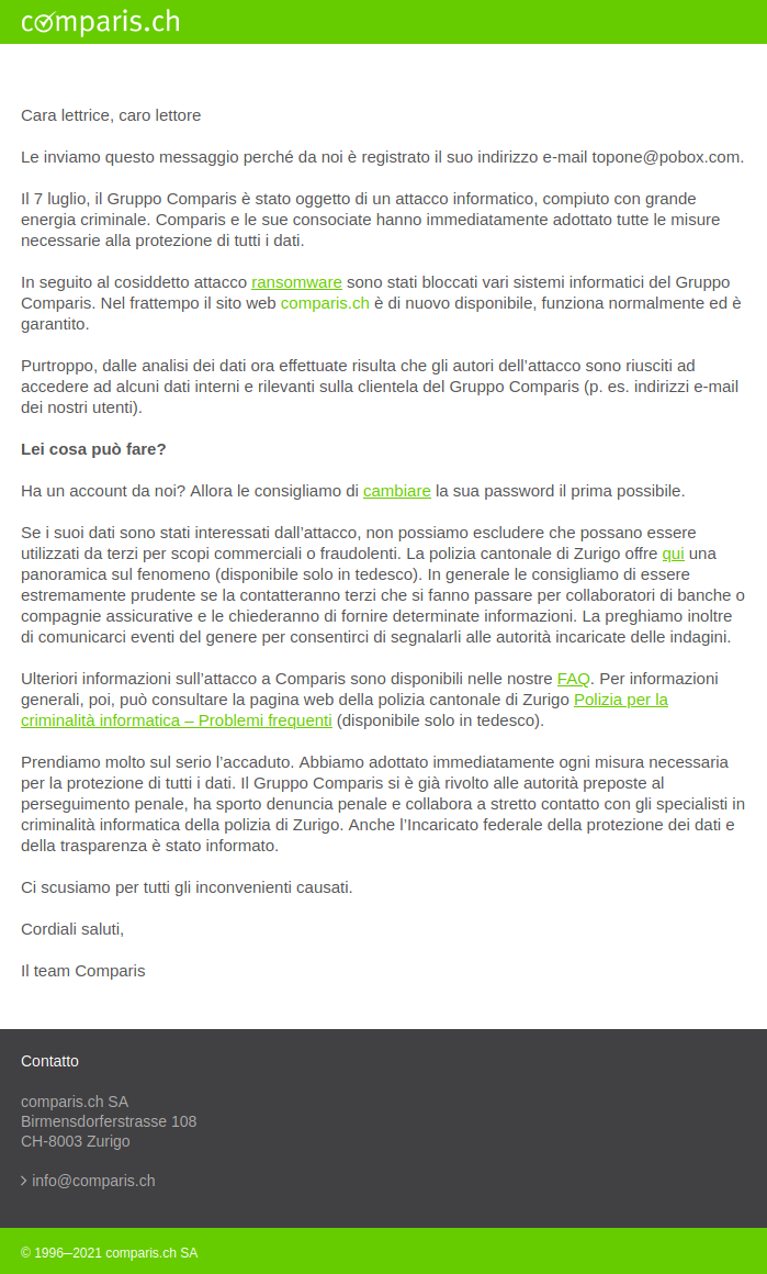 Anch’io sono fra i tanti utenti svizzeri di Comparis.ch, il popolare sito di confronti fra prodotti e servizi (80 milioni di visite l’anno) che è stato colpito da un attacco informatico, basato sul ransomware, il 7 luglio scorso, come raccontato da La Regione/ATS.