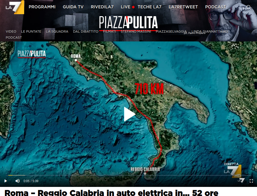 Piazzapulita, il programma di La7, ha diffuso ieri un servizio firmato da Chiara Proietti D’Ambra che descrive un suo viaggio da Roma a Reggio Calabria (710 km), fatto in auto elettrica, che ha richiesto cinquantadue ore.