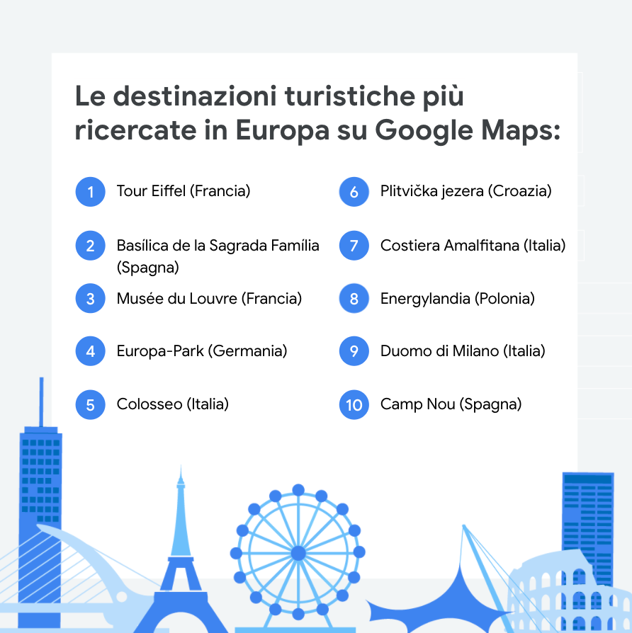 Con l’avanzare delle campagne di vaccinazione e la riapertura dei paesi abbiamo assistito a un aumento dell’ottimismo e della disponibilità a recuperare il tempo e i viaggi persi. Dall’inizio dell’anno, le dieci destinazioni turistiche più ricercate in Europa su Google Maps sono: Tour Eiffel (Francia), Basílica de la Sagrada Família (Spagna), Musée du Louvre (Francia), Europa-Park (Germania), Colosseo (Italia), Plitvička jezera (Croazia), Costiera Amalfitana (Italia), Energylandia (Polonia), Duomo di Milano (Italia) e Camp Nou (Spagna).