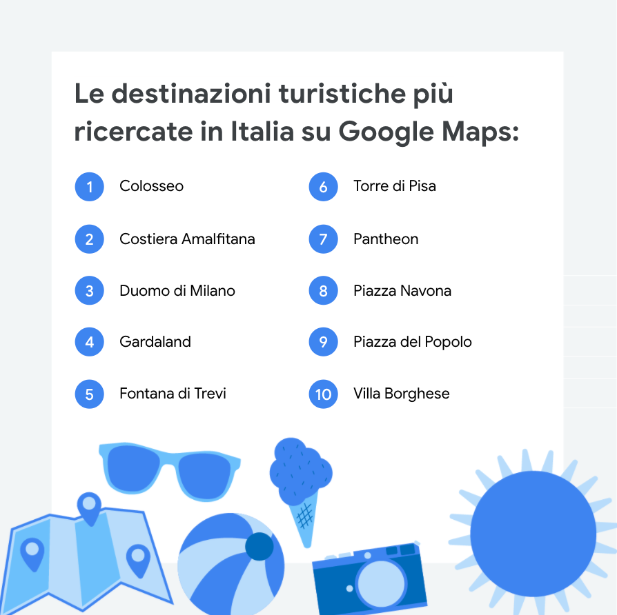 Se guardiamo ora al nostro Paese, le dieci destinazioni turistiche più ricercate in Italia su Google Maps sono: Colosseo, Costiera Amalfitana, Duomo di Milano, Gardaland, Fontana di Trevi, Torre di Pisa, Pantheon, Piazza Navona, Piazza del Popolo, Villa Borghese.