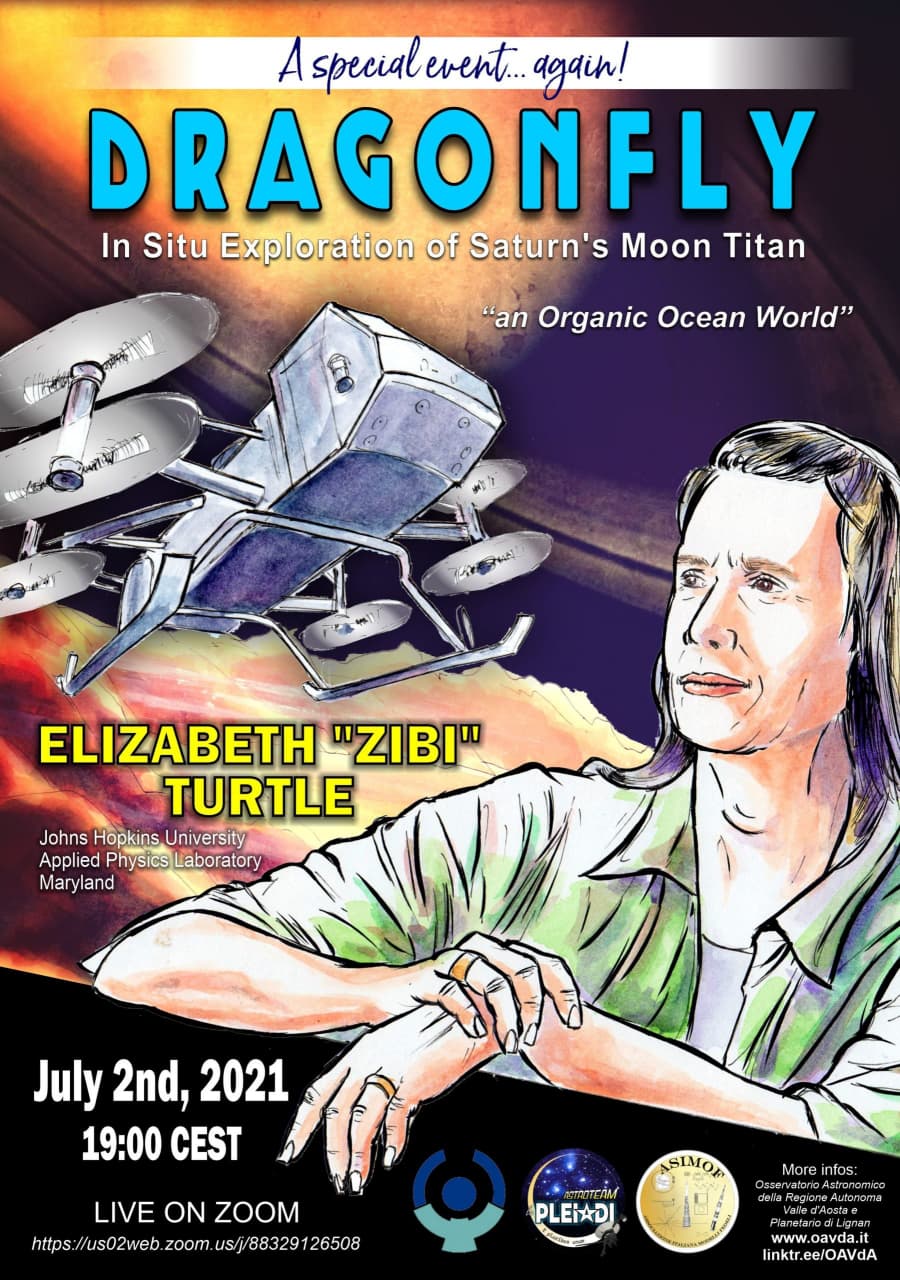 A luglio 2021 l’Osservatorio Astronomico della Regione autonoma Valle d’Aosta, Astroteam Le Pleiadi e ASIMOF hanno organizzato un incontro su Zoom, aperto al pubblico, con Elizabeth (Zibi) Turtle, principal investigator del progetto Dragonfly, che intende far volare un drone di ricognizione su Titano, la più grande luna di Saturno, nel 2034. Ne avevo scritto qui a suo tempo.