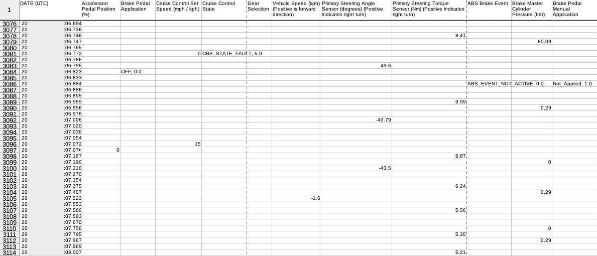 Ogni riga include un’indicazione della data e dell’ora precisa di ciascun evento registrato. E gli eventi sono davvero tanti: vengono memorizzati oltre 240 parametri distinti, che permettono di ricostruire la dinamica di un incidente in estremo dettaglio. Istante per istante, la telemetria annota diligentemente dati ovvi come la velocità, la direzione di marcia o l’azionamento del freno o dell’acceleratore e dati meno intuitivi come il rilevamento della presenza delle mani sul volante, l’accelerazione laterale e longitudinale, la velocità di rotazione del veicolo intorno all’asse verticale (in pratica la direzione nella quale sta curvando), la posizione del volante, l’attivazione dell’ABS, le impostazioni delle funzioni di guida assistita e persino le regolazioni dell’aria condizionata e dello sbrinatore e delle luci interne.