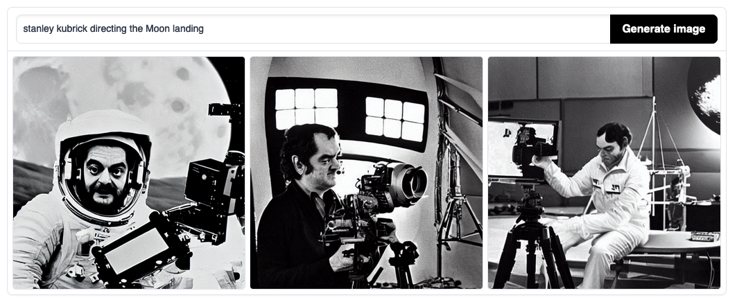 Questa distorsione dei volti sembra essere una caratteristica ricorrente dei generatori di immagini. Ho chiesto sempre a Stable Diffusion di generarmi un’immagine del regista Stanley Kubrick che dirige il filmato dello sbarco sulla Luna, per prendere in giro i complottisti, e ho ottenuto delle foto in bianco e nero inquietantemente realistiche, che mostravano una persona che somigliava a Kubrick ma non era lui.