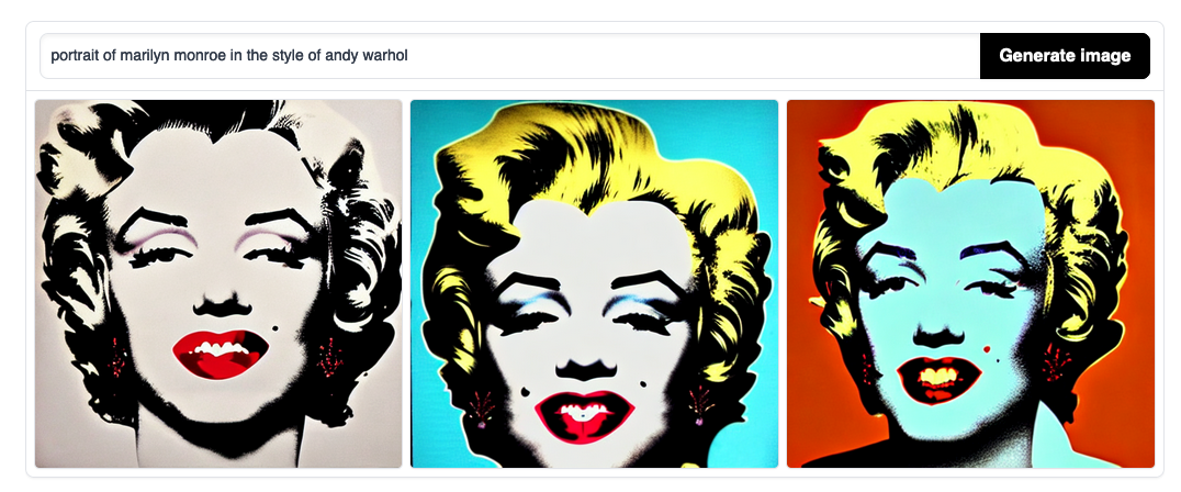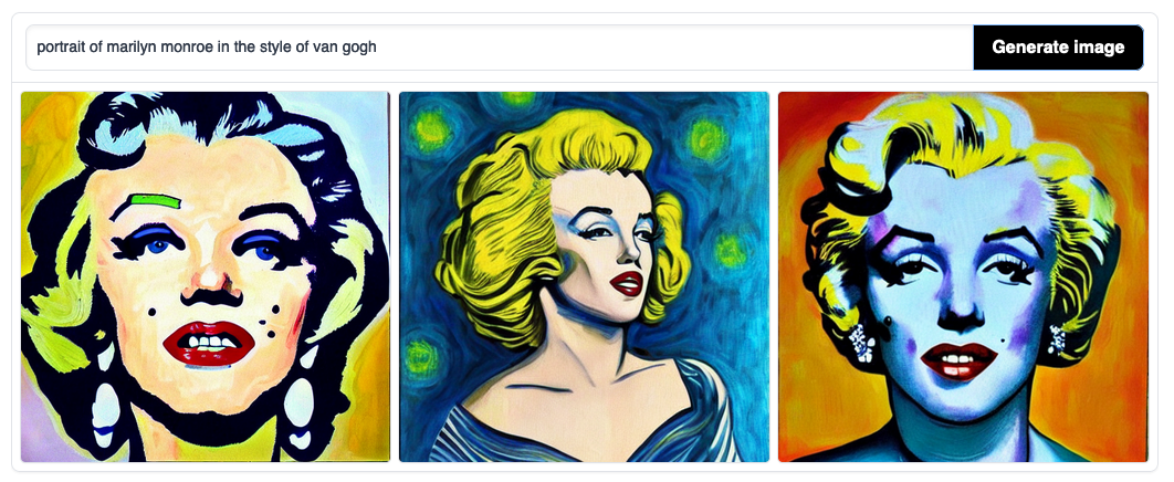 Un’altra funzione affascinante dei generatori di immagini è l’imitazione degli stili. Si può chiedere, per esempio, un ritratto di una persona famosa fatto con lo stile di un certo artista. Marilyn Monroe come l’avrebbe raffigurata Andy Warhol? Fatto. Sempre Marilyn, ma nello stile di Vincent van Gogh? Idem. E tutto esente da problemi di copyright, perché solo le persone hanno diritti d’autore, i software no.