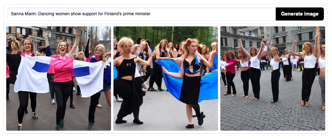 Per esempio, ho provato a chiedere a uno di questi software, chiamato Stable Diffusion, di generare un’illustrazione della recente notizia delle donne che pubblicano online proprie foto scattate mentre ballano in segno di solidarietà con il primo ministro finlandese Sanna Marin, colpita da una polemica per alcune sue immagini ritenute troppo festaiole, e ho ottenuto subito qualcosa di utilizzabile: donne che ballano in strada tenendo bandiere finlandesi. O perlomeno qualcosa che a prima vista sembravano immagini di donne, ma guardando bene mi sono accorto che avevano volti mostruosamente distorti.