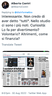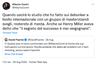 Alberto Contri, ex direttore di Pubblicità Progresso, docente IULM, annuncia uno “studio” sui debunker, manifesta complottismi a pioggia. Poi cancella (quasi) tutto