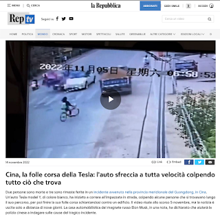 È arrivata anche sui media italiani la notizia di un incidente mortale avvenuto in Cina alcuni giorni fa. Per come ne parla per esempio Repubblica, una Tesla Model Y avrebbe “iniziato a correre all’impazzata in strada”, come se l’auto avesse fatto tutta da sola. Lo stesso articolo descriveva inizialmente Elon Musk come un “magnate russo” [sic], come si vede nello screenshot qui accanto, quindi potete immaginare con quanta cura sia stato redatto.