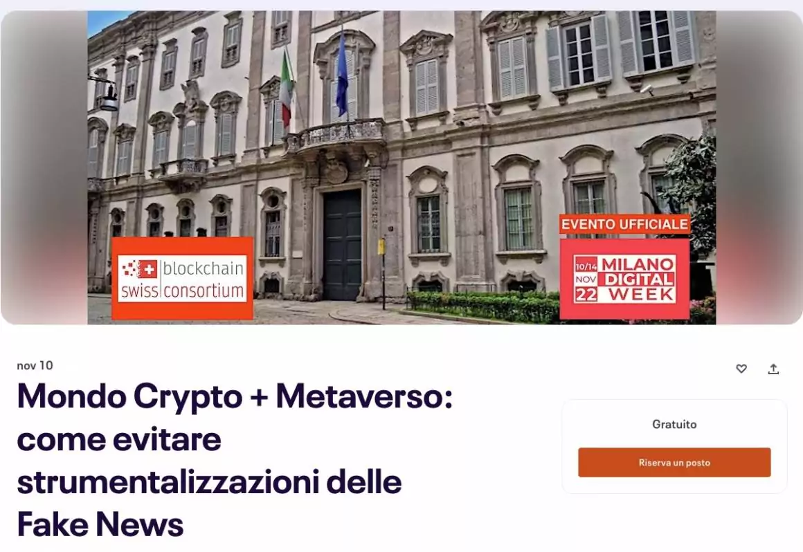 EVENTO UFFICIALE INSERITO NEL CARTELLONE DELLA MILANO DIGITAL WEEK PROMOSSA DAL COMUNE DI MILANO DATA & LOCATION: 10/11/2022 ORE 17:30 – 19:30 PALAZZO CUSANI MILANO BIGLIETTI GRATUITI CLICCA QUI:https://www.eventbrite.it/e/biglietti-la-strumentalizzazione-delle-fake-news-nel-mondo-crypto-e-metaverso-429716131517 DESCRIZIONE…