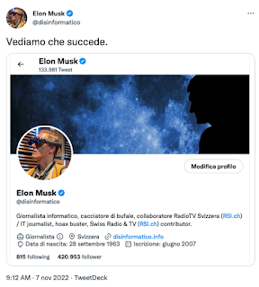 E così ho cambiato il mio nome su Twitter come vedete qui sopra, come gesto di protesta all’assurdità di Musk di essere così feroce contro gli impersonatori ma dichiararsi un paladino della libertà di espressione. Usare un nome parodistico è una forma di espressione: sto solo esercitando la libertà che Musk dichiara di avere così a cuore.