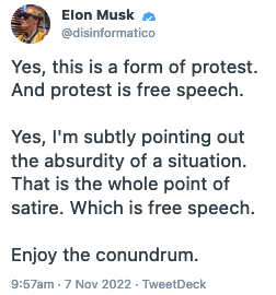 Questa è una forma di protesta. E la protesta è espressione. Questa è satira. E la satira è una forma di espressione. Elon Musk dice di essere a favore della libertà assoluta di espressione, ma dice anche che sospenderà permanentemente e senza preavviso chi impersonerà qualcuno senza dichiararlo esplicitamente, e questo va contro la sua asserita libertà assoluta di espressione.