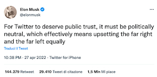 Un commento di propaganda politica in piena contraddizione con i proclami di Musk sulla necessità che Twitter non prenda posizioni politiche: “per meritarsi la fiducia del pubblico, deve essere politicamente neutro”.