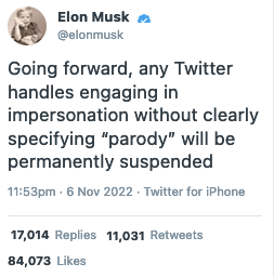Elon Musk stanotte ha tweetato che in futuro qualunque utente che tenti di impersonare qualcuno senza specificare chiaramente che si tratta di parodia verrà sospeso permanentemente (“Going forward, any Twitter handles engaging in impersonation without clearly specifying “parody” will be permanently suspended”) e senza preavviso. Ci sono già stati alcuni casi.