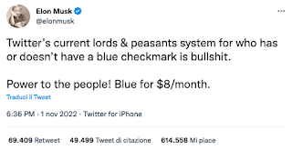 Non è questione di pagare otto dollari al mese o di truffe basate su false identità. È questione di creare un Twitter a due velocità, una per paganti e l’altra per plebei, dopo aver detto che Twitter attualmente ha un “sistema di nobili e plebei“ che “è una stronzata”.