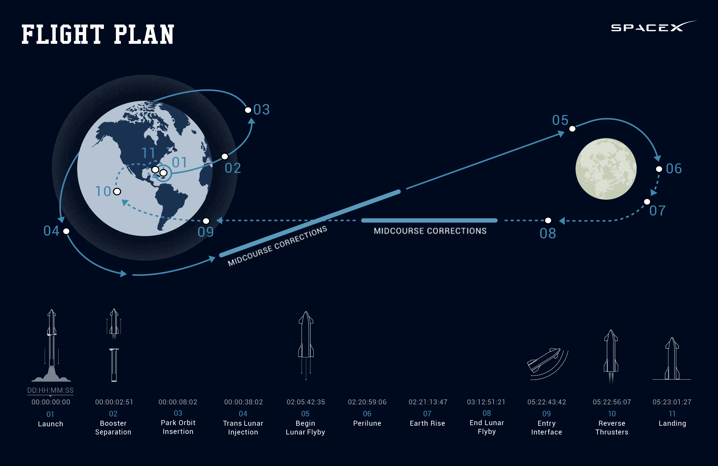 Trentotto minuti dopo la partenza, dopo aver compiuto meno di un’orbita intorno al nostro pianeta, Starship riaccenderà i motori per accelerare verso la Luna, che raggiungerà dopo circa due giorni di viaggio. Effettuerà per circa un giorno una semplice, singola circumnavigazione della Luna, senza inserirsi in orbita intorno ad essa ma seguendo una traiettoria di ritorno spontaneo (free return) che non richiede propellente, e tornerà verso la Terra, che raggiungerà dopo altri due giorni di viaggio, per poi atterrare verticalmente e posarsi al suolo con il suo equipaggio dopo poco meno di sei giorni complessivi. Al suolo… o quasi, come vedremo tra poco.