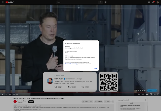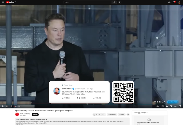 Facendo scorrere il video, però, mi sono accorto che non era affatto una diretta, ma era una replica di una presentazione fatta da Elon Musk tempo fa, ed è comparso in sovrimpressione un codice QR insieme all’immagine di un tweet di Elon Musk che diceva “La tua vita cambierà entro pochi minuti se scansionerai il codice QR. Non è uno scherzo.”