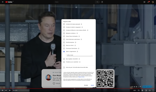 Ovviamente si trattava di una trappola: se avessi abboccato, avrei mandato dei soldi non a SpaceX o a Elon Musk ma a degli sconosciuti, che sicuramente avrebbero fatto qualunque cosa tranne rimandarmene il doppio. Ho quindi segnalato a YouTube che si trattava di spam, usando l’apposita funzione e scegliendo la sezione “Spam o ingannevole” e poi “Truffe o frodi”, e infine ho descritto le ragioni della segnalazione.