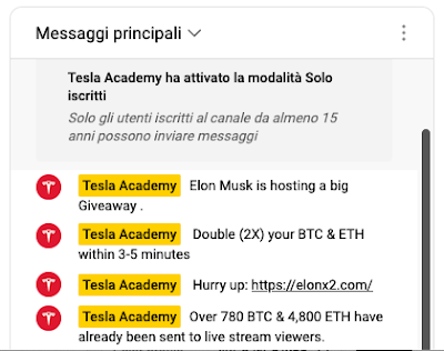 Per esempio, nei video che mi vengono consigliati da YouTube mi è comparso l’avviso di un video in diretta il cui titolo parlava di SpaceX, la società spaziale di Elon Musk, e annunciava un aggiornamento da parte di Musk stesso sul lancio del razzo gigante Falcon Heavy, un argomento che effettivamente mi interessa. L’account che presentava il video aveva il marchio di Tesla, altra azienda di Musk, e si faceva chiamare Tesla Academy.