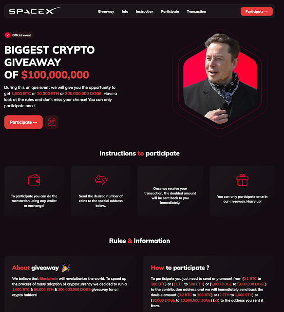 Cliccando sul link o seguendo il codice QR si veniva portati a un sito contenente un annuncio, con tanto di logo di SpaceX e ritratto di Elon Musk, che spiegava i dettagli della partecipazione. Per raddoppiare le proprie criptovalute era sufficiente inviarle al sito.