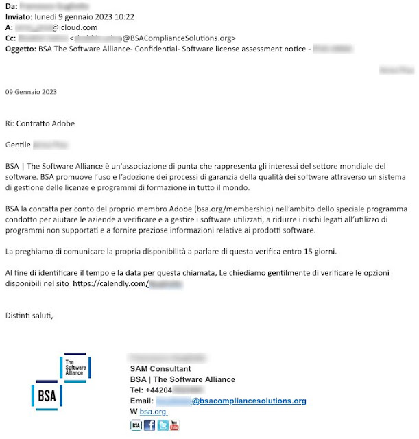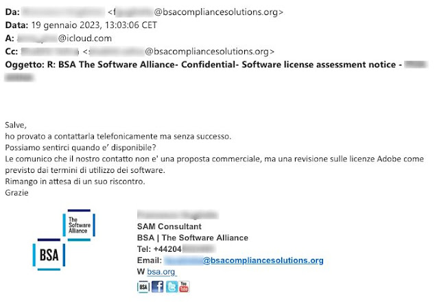 In altre parole, per un utente comune questa mail è impossibile da verificare e ha molti elementi sospetti. L’unico modo per sapere se è autentica o no è contattare la BSA e chiederglielo.