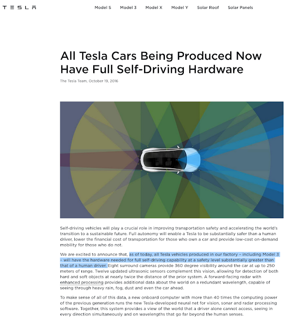 Però il giorno precedente, ossia il 19 ottobre 2016, Tesla aveva pubblicato un articolo che titolava che “tutte le auto Tesla attualmente in produzione hanno hardware per la guida autonoma completa” (“All Tesla Cars Being Produced Now Have Full Self-Driving Hardware”) e ribadiva il concetto nel testo (“as of today, all Tesla vehicles produced in our factory – including Model 3 – will have the hardware needed for full self-driving capability at a safety level substantially greater than that of a human driver”).