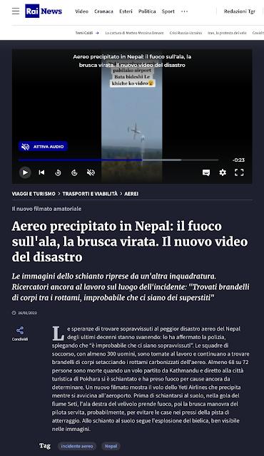 Rainews ha pubblicato un articolo (copia permanente) incentrato su quello che presenta come “nuovo video del disastro”, riferendosi alla caduta di un aereo ATR-72 avvenuta in Nepal il 15 gennaio scorso.