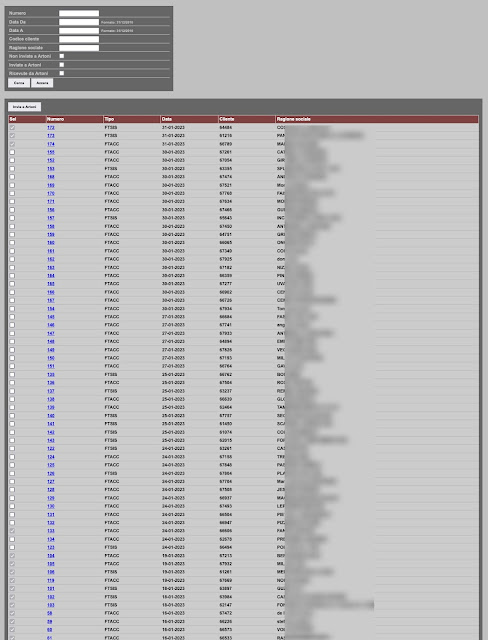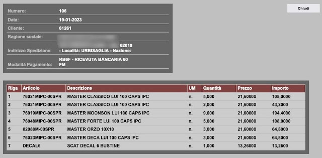 Cliccando sui link delle singole ordinazioni si possono vedere i dettagli: per esempio quelli dell’azienda di Urbisaglia, in provincia di Macerata, che paga con ricevuta bancaria a 60 giorni fine mese e ordina circa 600 capsule di caffè e spende quasi 600 euro, o la signora Antonella, di Genova, che paga le sue capsule di caffè con la carta di credito.
