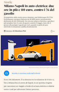 In molti mi state segnalando questo articolo di Simonluca Pini sul Sole 24 Ore, il cui titolo dice che per fare “Milano-Napoli in auto elettrica” servono “due ore in più e 110 euro, contro i 76 del gasolio”.
