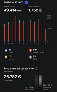* Senza le ricariche gratuite, alla sua tariffa domestica di 0,30 eurocent/kWh, il risparmio sarebbe stato intorno ai 4.000 euro/anno. La persona è stata lungimirante e ha acquistato un veicolo il cui prezzo include ricariche gratuite a vita. Tariffe inferiori, e quindi risparmi maggiori, si possono avere usando pannelli solari o abbonamenti forfetari.