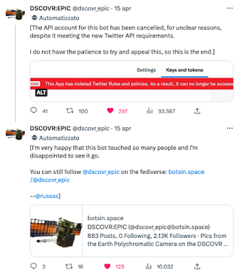 stato annullato il 15 aprile per una “violazione” imprecisata. L’account è ora operativo su Mastodon