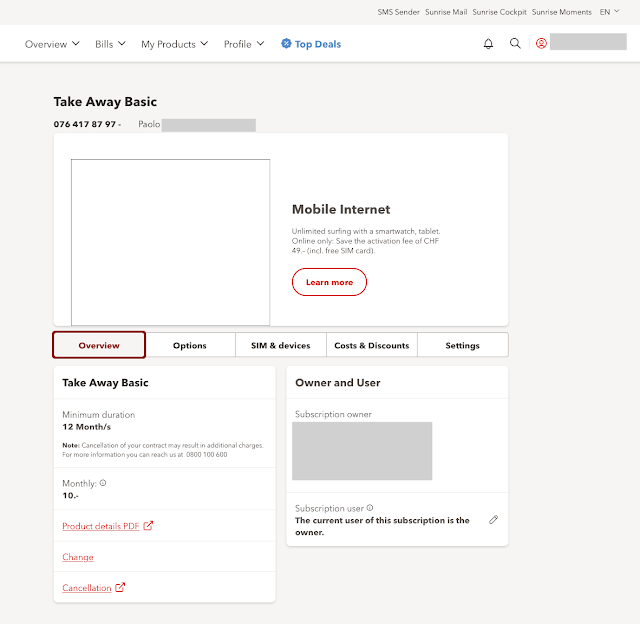 Qualche giorno fa sono entrato nel mio account Sunrise, dove ho una SIM prepagata usata dalla Dama del Maniero, e ho trovato questa voce imprevista (le