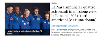 Oggi sono stati rivelati al pubblico i nomi delle quattro persone che effettueranno il primo volo umano intorno alla Luna del ventunesimo secolo, a cinquant’anni dall’ultima missione lunare, Apollo 17, nel 1972: sono Reid Wiseman, Victor Glover, Christina Koch e Jeremy Hansen.