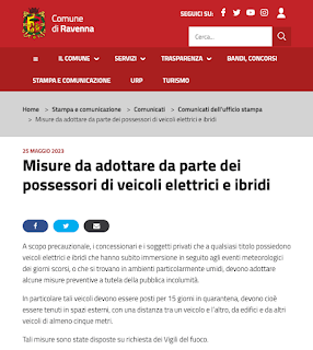 Mi sono arrivate parecchie richieste di chiarimento a proposito del comunicato stampa del Comune di Ravenna del 25 maggio 2023 che dispone una sorta di quarantena per i veicoli elettrici e ibridi che sono stati colpiti dagli allagamenti dei giorni scorsi.