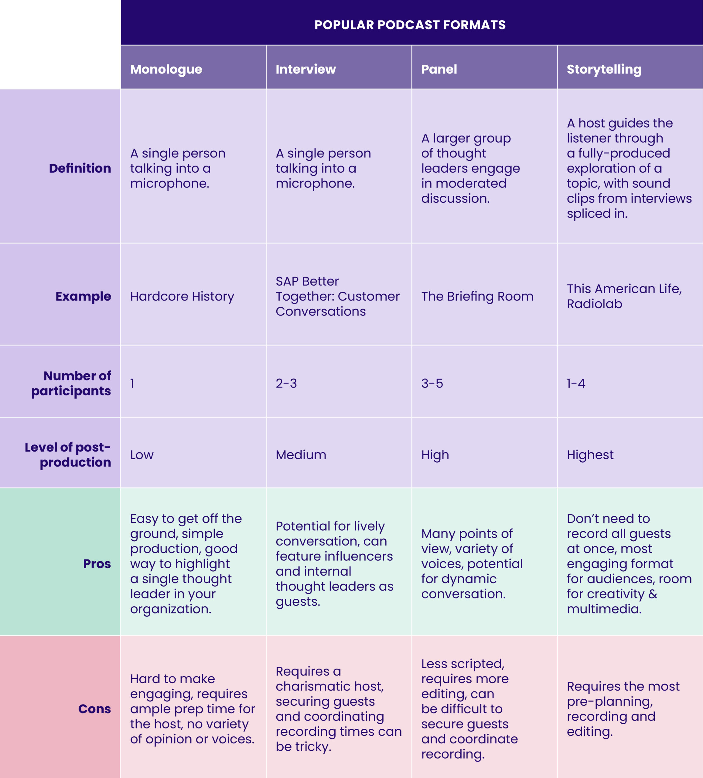 There’s no right or wrong way to produce a podcast. Here are the most popular formats, with a few considerations for each.