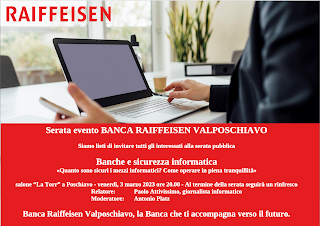 Questa sera alle 20 sarò ospite di Banca Raiffeisen Valposchiavo per una serata pubblica sul tema delle banche e della sicurezza informatica dal punto di vista dell’utente e cliente; racconterò le mie esperienze nel settore e presenterò dati e consigli per operare in piena tranquillità con i conti bancari online.