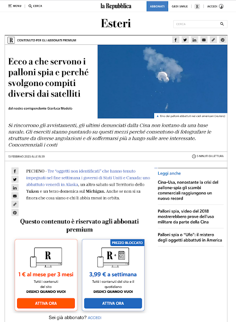 Repubblica insiste a chiedere soldi in cambio di parole in libertà. Oggi Gianluca Modolo ci insegna che gli oggetti abbattuti nei cieli statunitensi e canadesi erano in orbita.